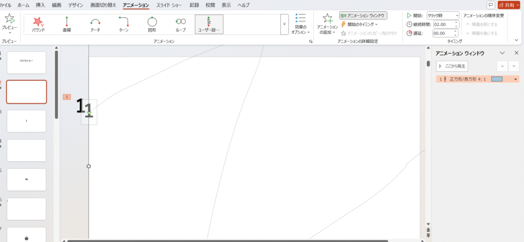 ①PowerPointの白紙の画面から作ります。好きな素材を白いスライドからはみ出した位置に置き、「アニメーション」のタブから「アニメーションの軌跡」を選びます。その中の「ユーザー設定パス」を選ぶと、自分の好きな動きをするように設定することができます。