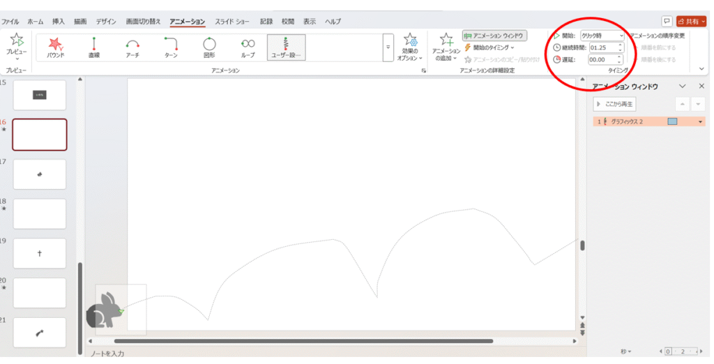 素材を実際に動かしてみて、簡単そうなら、継続時間を操作して、早くしたり、遅くしたりして、難易度を調整してみてください。「早すぎてわからない!」と言われるようなことが想定される場合は、そのスライドをコピーして、継続時間のみを長くするスライドを次に作っておくと良いと思います。