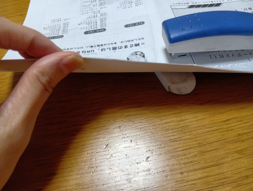 下に大きめの消しゴムを置き、真ん中でホッチキスを押します。針が下の消しゴムに刺さるので、抜いて、針の部分を折り曲げたら、完成です!